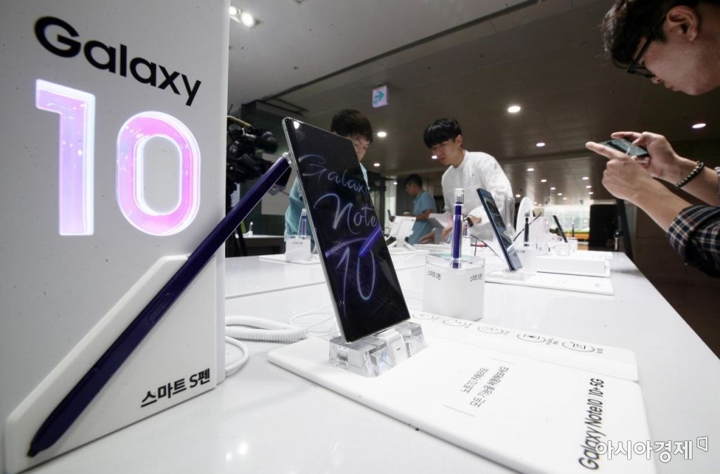 삼성전자가 하반기 전략 스마트폰 '갤럭시노트10'을 공개했다. 지난 8일 서울 삼성전자 태평로본관 모바일스토어에서 방문객들이 갤럭시노트10을 만져보고 있다./김현민 기자 kimhyun81@