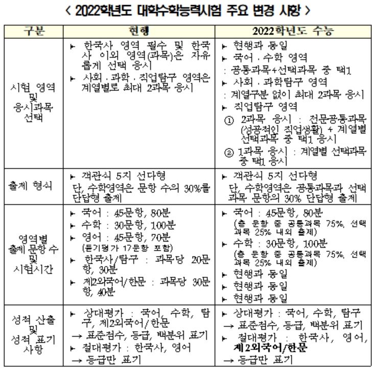 교육부 13일 '2022 수능 기본계획'을 확정하고 이같은 내용을 발표했다. 앞서 교육부는 지난해 8월 2022학년도 대학입학제도 개편 방안을 발표하면서 수능의 개괄적인 변화 방향도 제시한 바 있다.