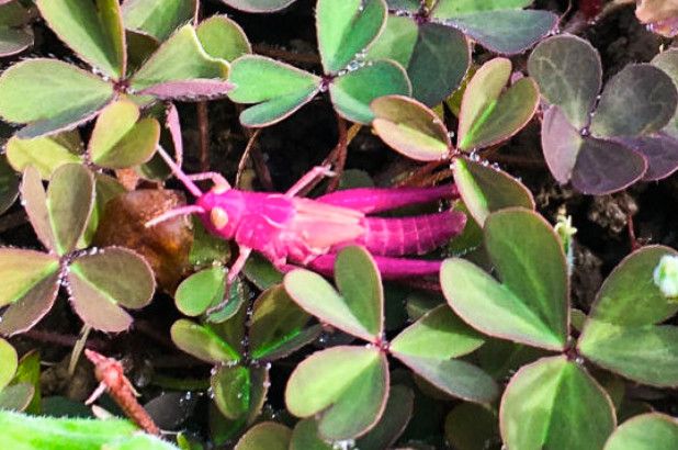 메뚜기는 보통 갈색이거나 초록빛을 뗘야 정상이지만 분홍 메뚜기는 적발증이라는 유전자 이상이 원인으로 알려졌다.