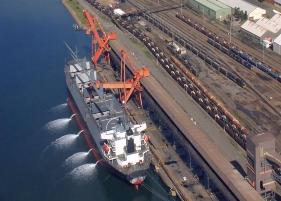 화물을 적재하면서 선박평형수를 배출하고 있는 선박의 모습. [사진=유튜브 화면캡처]