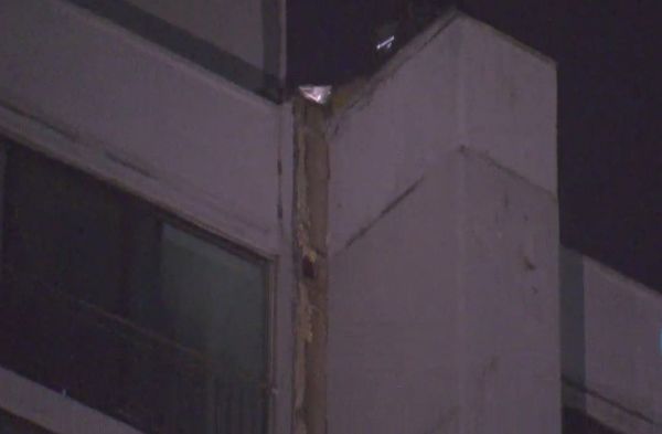 18일 수원시 권선구 구운동의 한 아파트 외벽에 균열이 발생했다. 사진은 외벽균열 사고현장./사진=KBS 방송 화면 캡처