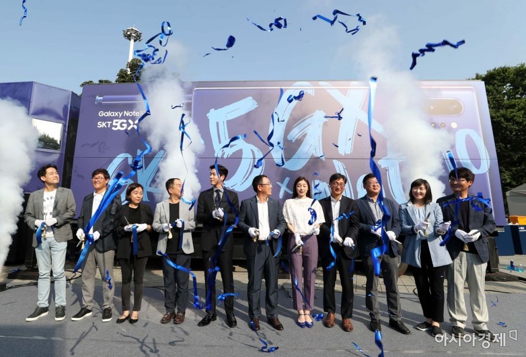 20일 서울 송파구 올림픽공원 우리금융아트홀 앞에서 SK텔레콤 주최로 열린 갤럭시노트10 체험 트레일러 출정식에서 홍보모델인 김연아, 유영상 SK텔레콤 MNO 사업부장 등 참석자들이 기념촬영을 하고 있다. /문호남 기자 munonam@