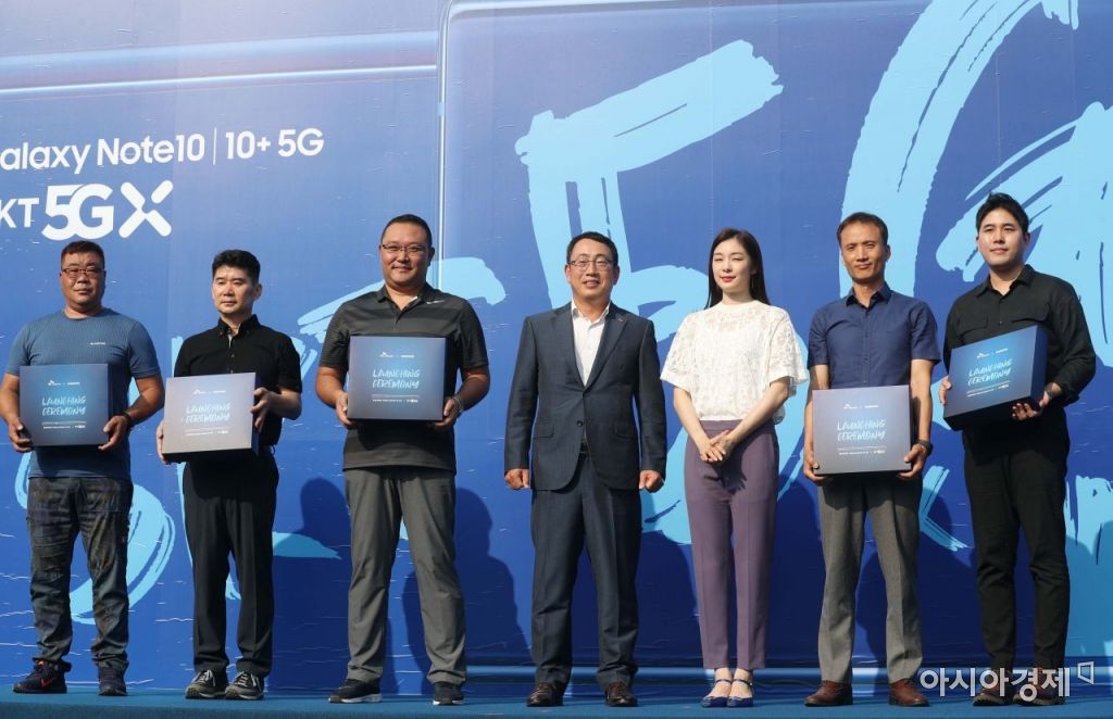 20일 서울 송파구 올림픽공원 우리금융아트홀 앞에서 SK텔레콤 주최로 열린 갤럭시노트10 출시 기념행사에서 홍보모델인 김연아(오른쪽 세 번째)와 유영상 SK텔레콤 MNO 사업부장(네 번째), 노트 시리즈를 이용하는 우수 고객들이 기념촬영을 하고 있다. /문호남 기자 munonam@