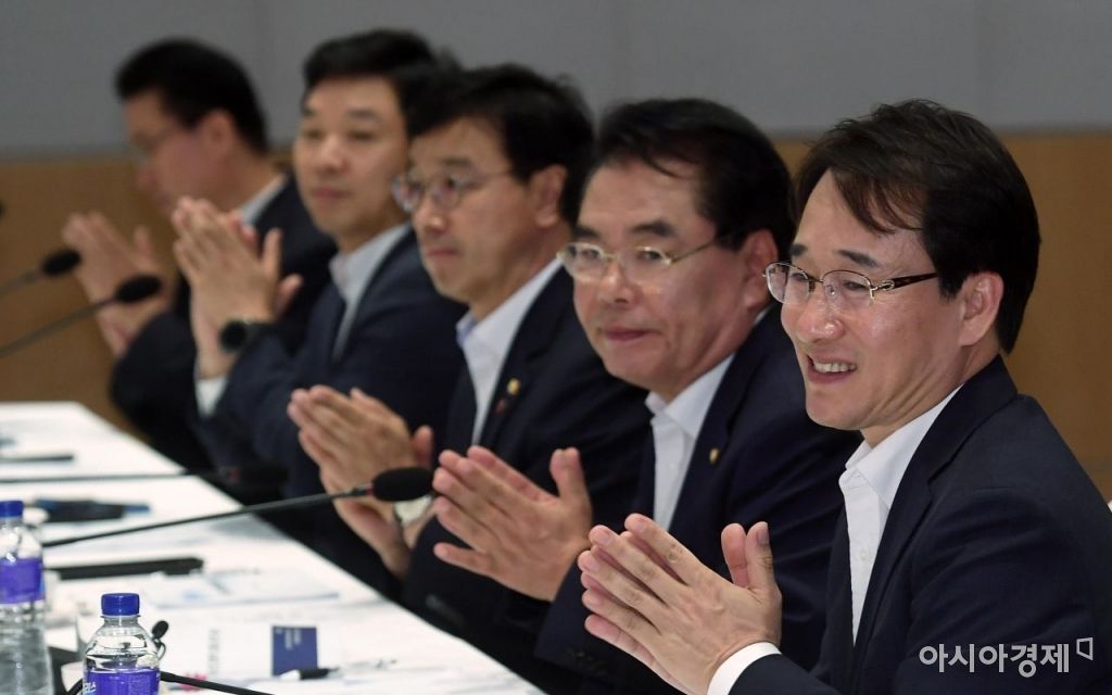 이원욱 더불어민주당 원내수석부대표(맨 오른쪽)을 비롯한 참석 의원들이 20일 서울 여의도 전경련회관에서 열린 한국경제연구원과의 정책간담회에서 박수치고 있다./김현민 기자 kimhyun81@