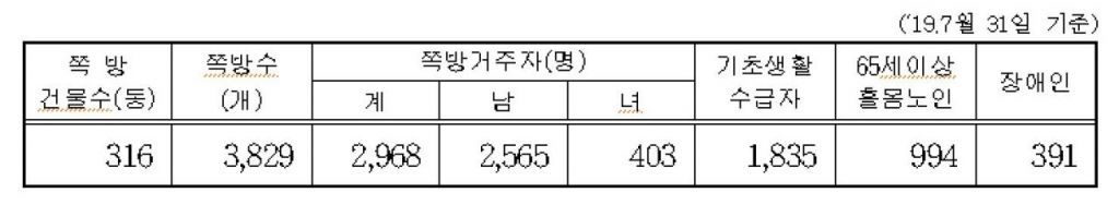 서울지역의 쪽방 거주자는 약 2968명이다. 서울시는 쪽방밀집지역 거주가구 중 약 61.8%가 주거급여 수급자인 것으로 파악하고 있다. 시는 이번 집중상담을 통해 지원대상자를 새롭게 발굴, 지원해 저소득 주거취약계층의 주거권을 향상시켜 나간다는 목표다.