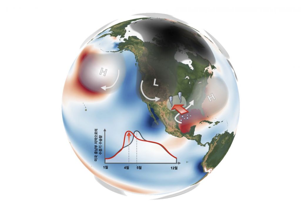 중앙 태평양 지역이 평년보다 따뜻하고 미 서쪽 해안이 차가우며 멕시코 만이 따뜻할 때, 중앙 태평양부터 멕시코 만 일대에 '고기압-저기압-고기압'으로 파동 형태의 기압패턴이 형성된다. 연구진은 이러한 기압패턴이 4월에 형성될 경우 멕시코 만에서부터 다량의 수증기를 유입시키는 것을 발견했다. 이 수증기는 미 서부 록키산맥 우측을 따라 수송돼 내륙의 강한 바람을 회전시키는 연료 역할을 한다. 그 결과 동부 내륙에 토네이도가 발생한다는 것이다.