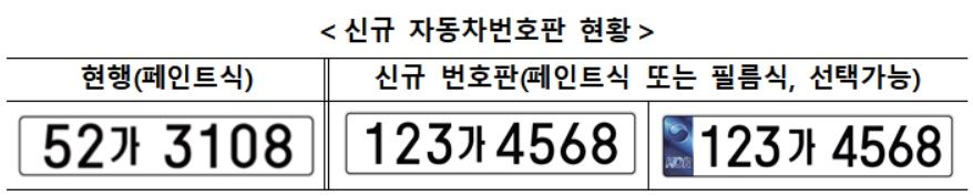 새로 도입하는 번호판에는 앞자리 숫자가 하나 추가되며, 기존의 흰색 번호판을 그대로 유지하는 '페인트식 번호판'과 왼쪽에 태극문양 홀로그램 등 청색 문양을 포함한 '재귀 반사식 번호판' 2가지로 혼용된다.