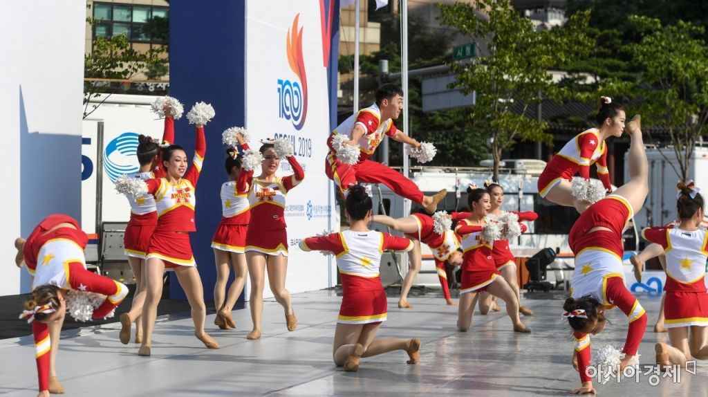 25일 서울 중구 서울광장에서 열린 '서울국제치어리딩스포츠대회'에 참가한 대학 치어리더팀이 멋진 공연을 선보이고 있다. 서울시와 아시아대학스포츠연맹(AUSF)이 공동 주최한 이번 행사에는 중국, 대만 등 11개국 700여 명의 선수가 참가했다./강진형 기자aymsdream@