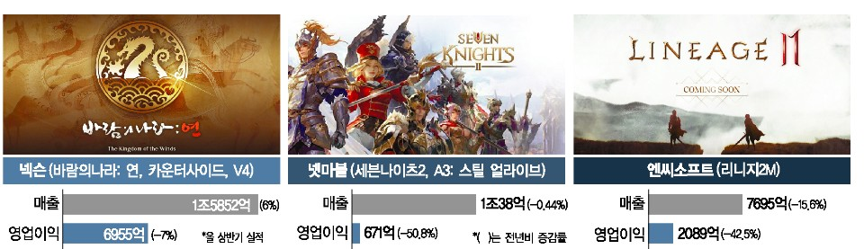 ◆넷마블, 자체IP로 '체질개선'=넷마블은 상반기에 '더 킹 오브 파이터즈 올스타', '일곱개의 대죄:그랜드크로스' 등 출시작들이 잇따라 흥행에 성공했지만 영업이익은 지난해에 비해 절반으로 줄었다. 신작의 성적이 온전히 반영되지 않은 데다가 이 게임들이 외부 IP를 활용해 로열티 등 수수료를 지급해야 하는 한계도 있었을 것으로 분석된다.