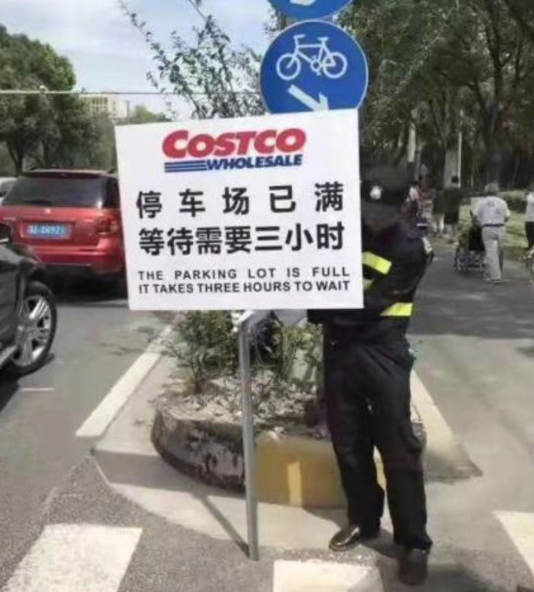 주차장 만차로 3시간을 기다려야 한다는 코스트코 안내 표지판. 사진:웨이보.