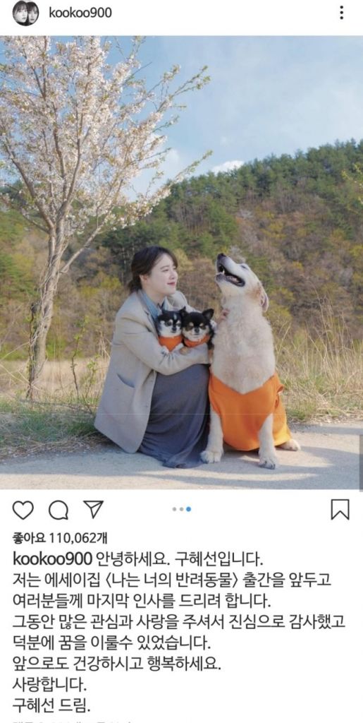 구혜선은 1일 자신의 인스타그램을 통해 에세이집의 일부를 발췌한 사진을 올리면서 "저는 에세이집 '나는 너의 반려동물' 출간을 앞두고 여러분들께 마지막 인사를 드리려 한다"고 밝혔다.