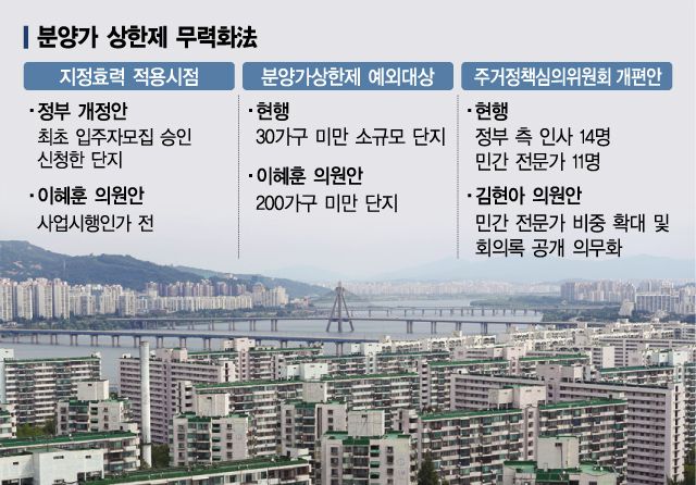 이번 개정안에는 또 분양가상한제 제외 대상을 30가구 미만 주택에서 200가구 미만으로 완화하는 내용도 담겼다. 시행령 기준대로 분양가상한제가 적용되면 가로주택정비사업 등 소규모정비사업이 타격을 받게 돼 자칫 노후 저층 주거지의 환경 개선은 물론 주택 공급이 줄어드는 부작용이 있을 수 있다는 우려 때문이다. 이 의원은 "인근 집값에 영향을 미치지 못하는 소규모 단지까지 집값 안정이라는 목표에 맞춰 분양가 상한제를 적용할 순 없다"면서 "현행 30가구 미만 기준을 200가구 미만으로 상향해야 한다"고 강조했다.