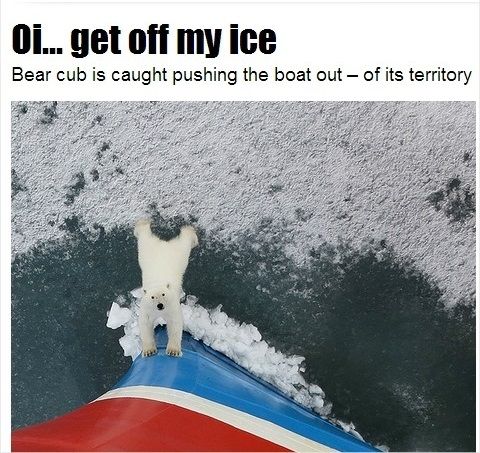 북극 노르웨이령 스발바르제도에서 한 관광 쇄빙선이 유빙을 헤치고 나아가는 앞에 아직 어린 북극곰 한 마리가 길을 막아서는 모습을 크리스 웨스트우드라는 선원이 촬영한 사진이 전 세계적 파장을 불러 일으킵니다. 주로 스캔들이나 선정적인 내용을 싣는 타블로이드판 대중지의 '내 얼음에서 손 떼(Oi...get off my ice)'라는 파격적인 제목이 대성공을 거둔 셈입니다.