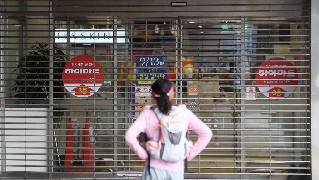이마트와 홈플러스, 롯데마트 등 대형마트 3개사의 서울 시내 점포가 추석 대목을 앞둔 주말인 8일 모두 문을 닫는다. 대형마트 3개사가 점포 소재지의 지자체에 휴업일(월2회 의무휴업) 변경을 요청했지만 ‘불가’ 통보를 받았다. 앞서 대형마트 3개사는 추석 직전 주말이 의무휴업일과 겹쳤다며 추석 당일인 13일로 변경해달라고 요구했지만 받아들여지지 않았다. 사진은 이날 문 닫은 서울의 한 대형마트 점포./김현민 기자 kimhyun81@