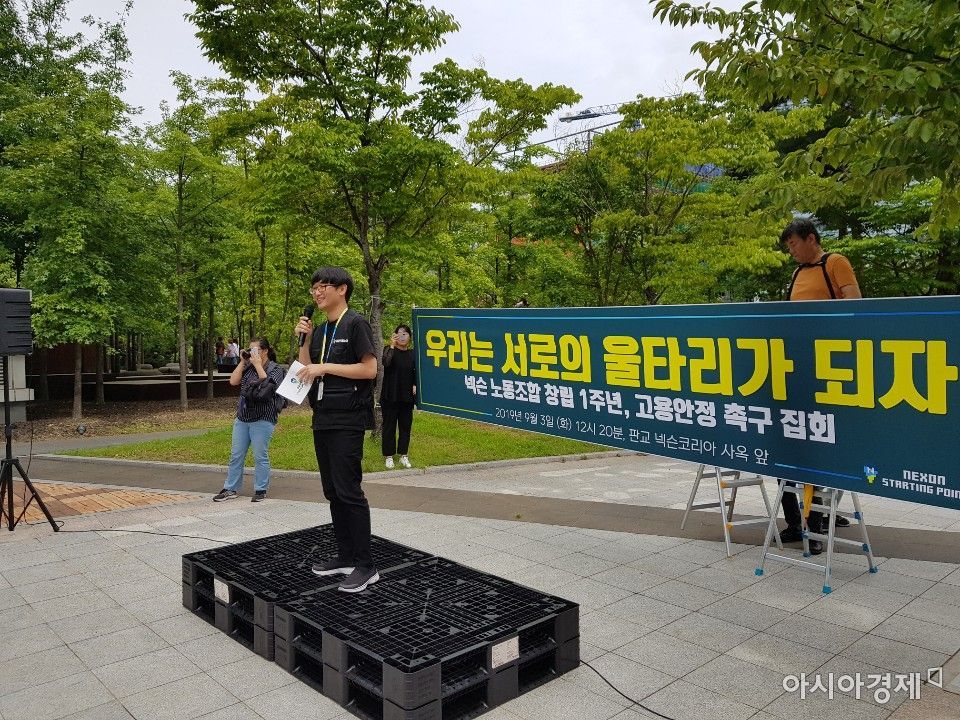 넥슨 노동조합 '스타팅포인트' 조합원들이 지난 3일 경기도 성남시 넥슨 사옥 앞에서 집회를 열고 고용안정을 촉구하고 있다.