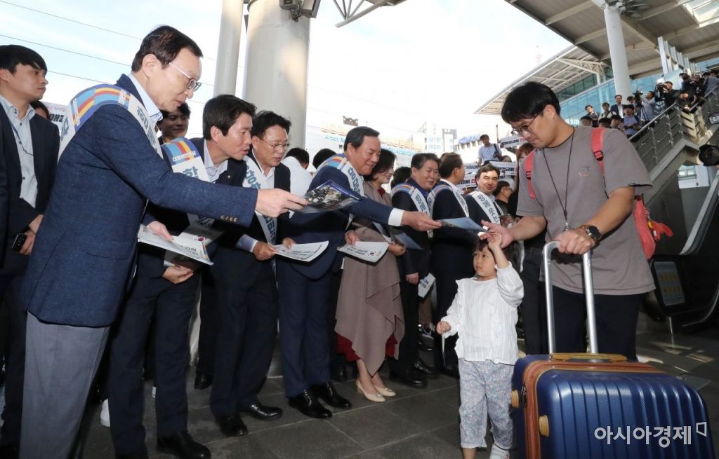 이해찬 더불어민주당 대표, 이인영 원내대표 및 소속 의원들이 추석 명절을 하루 앞둔 11일 서울 용산구 서울역에서 귀성객들에게 인사를 하고 있다. /김현민 기자 kimhyun81@