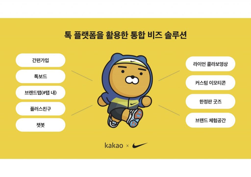 그동안 카카오는 모바일 메신저 카카오톡 채팅방 목록 상단에 노출되는 광고를 통해 나이키를 대대적으로 홍보했다. 광고를 클릭하면 나이키 브랜드탭으로 연결돼 각종 영상이 재생된다. 클릭 한 번만으로 나이키의 회원으로 가입하고 이모티콘 혜택을 받거나 게임에 참여할 수 있다.