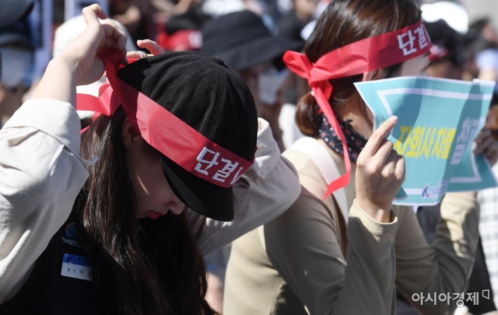 KTX 승무원 등 철도노조 코레일 관광개발지부 노동자들이 16일 서울역광장에서 파업 승리문화제를 하고 있다./김현민 기자 kimhyun81@