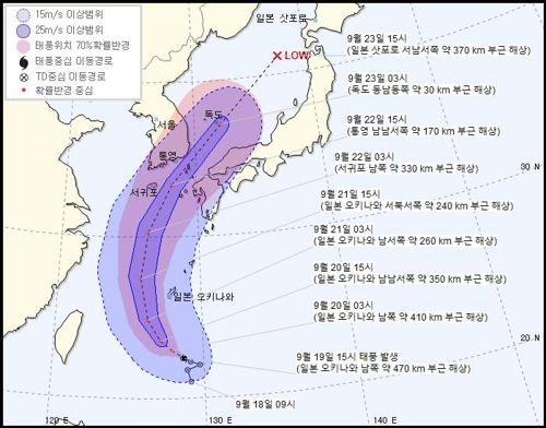 이 태풍은 이어 22일 오후 3시께 경남 통영 남남서쪽 약 170㎞ 해상을 지나고 대한해협 주변을 거쳐 23일 오전 3시께 독도 동남동쪽 약 30㎞ 해상에 있을 것으로 기상청은 내다봤다.
