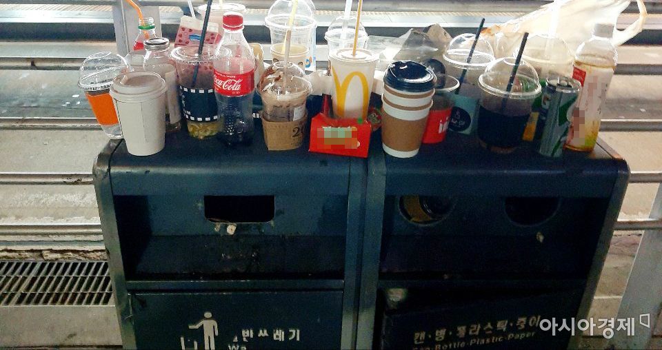 서울의 한 번화가에 비치된 쓰레기 분리수거함 위에 먹다 버린 커피가 담긴 플라스틱 커피 용기 등 쓰레기들이 어지럽게 널부러져 있다. 사진=한승곤 기자 hsg@asiae.co.kr