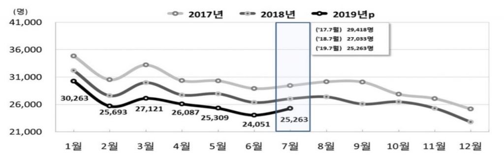 7월 출생아 수는 1981년 월별 통계 집계를 시작한 이후 가장 적었다. 전년 동월 대비 출생아 수는 2015년 12월부터 3년 8개월 연속 감소 행진을 이어가고 있다. 역대 최소 기록은 2016년 4월부터 3년 4개월째 어어지고 있다.