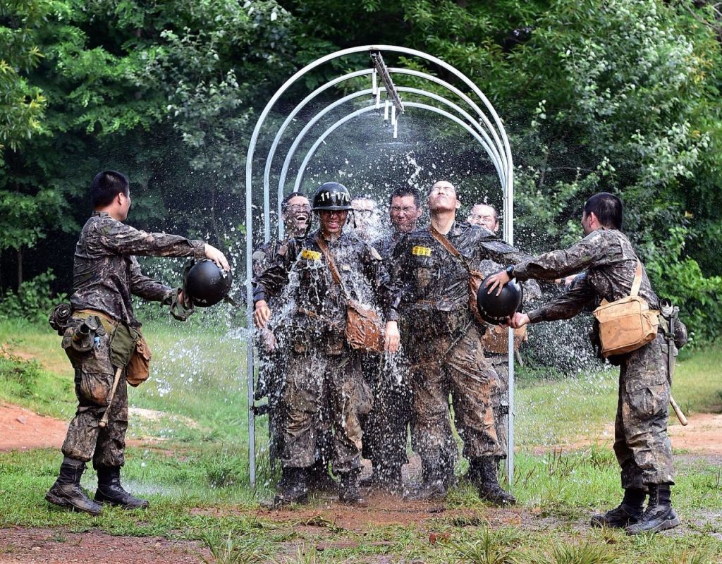지난달 8일 충남 논산 육군훈련소에서 훈련을 마친 훈련병들이 샤워터널을 지나며 더위를 식히고 있다. (사진=연합뉴스)