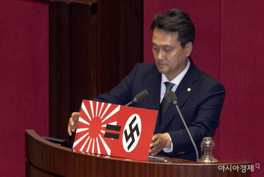 안민석 더불어민주당 의원이 30일 국회 본회의장에서 2020 도쿄 하계올림픽대회 및 하계패럴림픽대회에서의 욱일기 경기장 내 반입금지 조치 촉구 결의안 제안설명을 하기 전 욱일기와 나치 마크가 프린터 된 팻말을 내걸고 있다./윤동주 기자 doso7@