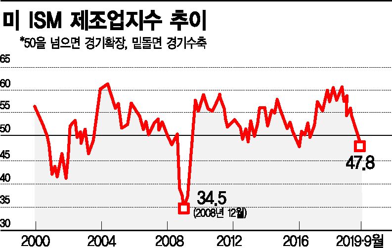 1일(현지시간) 미 공급관리협회(ISM)는 9월 제조업 구매관리자지수(PMI)가 47.8을 기록해 직전 달(49.1)보다 하락했다고 발표했다. 이는 글로벌 금융위기 직후인 2009년 6월(46.3) 이후 10년여 만에 가장 낮은 수치다. 시장 전문가들이 예상했던 9월 제조업 PMI는 50.2로, 제조업 경기가 반등할 것으로 봤지만 이 전망치도 크게 밑돌았다.