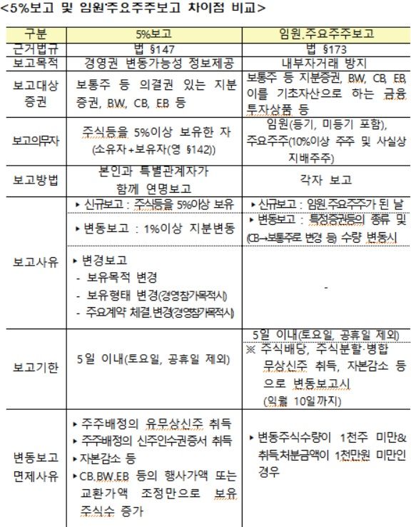 5%룰 보고 의무는 지지 않아도 임원·주요주주 보고는 해야 하는 경우도 있다. 주주배정의 신주인수권증서를 얻을 때 수량이 1000주 이상이거나 취득·처분금액이 1000만원 이상이면 임원·주요주주보고는 해야 한다. 주식분할·병합 시엔 지분율은 그대로라도 수량은 바뀌기 때문에 임원·주요주주 공시 의무가 발생한다.