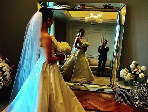 공개된 사진 속 권 씨는 웨딩드레스를 입고 거울 앞에 서있다. 거울 속에는 권 씨를 촬영하고 있는 지드래곤이 보인다.