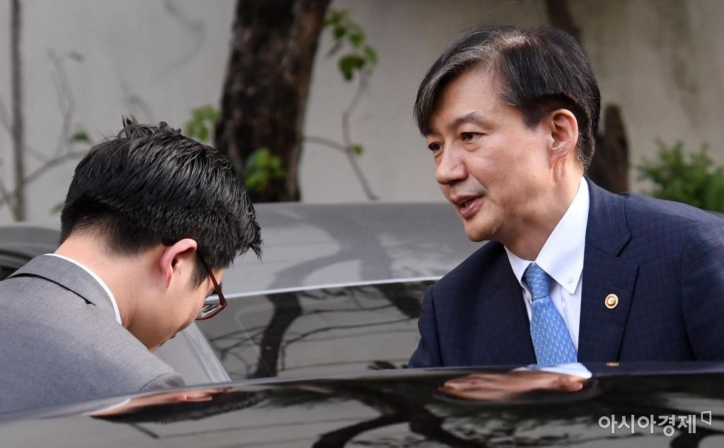 취임 35일 만에 전격 사의를 표명한 조국 법무부 장관이 14일 서울 서초구 자택 앞에서 법무부 직원과 인사하고 있다./김현민 기자 kimhyun81@