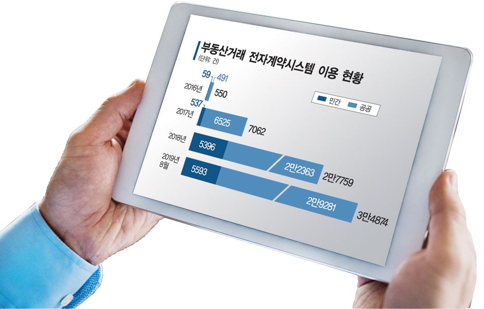 더욱이 부동산 거래의 대부분을 차지하는 민간의 활용률이 현저하게 적었다. 감정원에 따르면 민간 전자계약 건수는 2016년 전체 550건 중 59건, 2018년에는 2만7759건 중 5396건에 불과했다. 올해도 8월까지 전체 전자계약 3만4874건 중 5593건에 그쳤다.