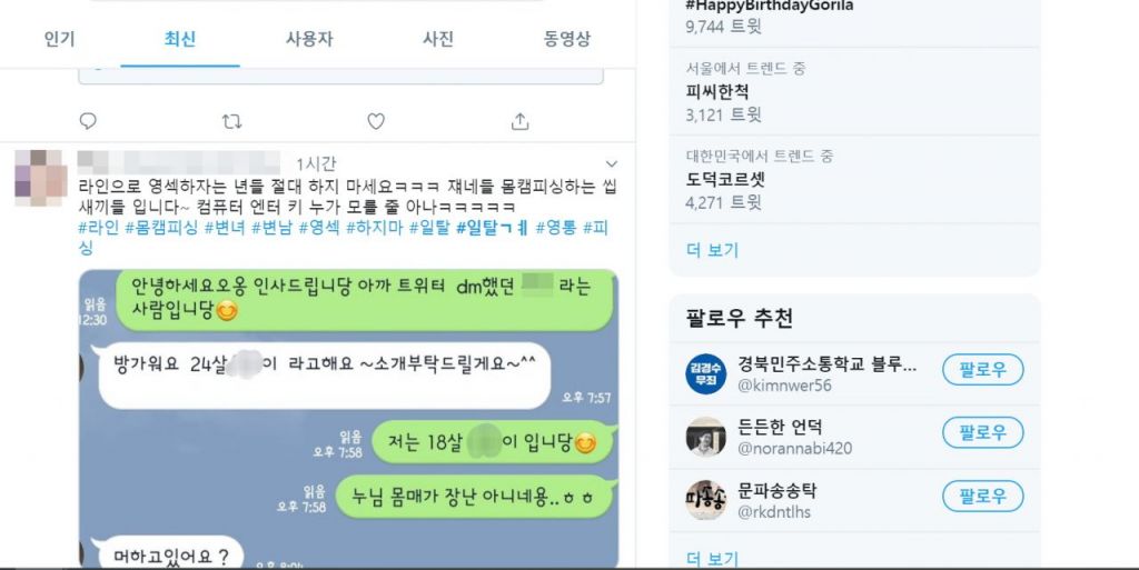SNS에 자신이 등장하는 음란물을 게시하고 음담패설을 나눌 목적으로 만들어지는 SNS 계정 '일탈계'. 사진=트위터 캡처