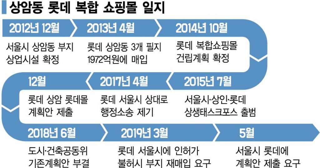 롯데는 상생 협의 과정에서 대형마트와 기업형슈퍼마켓(SSM)은 입점하지 않겠다고 약속했지만 지역 상인들은 3개 필지 중 2개 필지를 비판매시설로 운영해달라고 요구해 협상이 진척되지 않고 있다. 롯데는 결국 올해 초 서울시에 3필지 중 2필지를 합쳐서 개발하고 1개 필지를 비판매시설로 만드는 안건을 제출하고 이 안건이 수용되지 않을 경우 서울시가 다시 용지를 되사라는 내용의 공문을 보냈다. 이에 서울시는 지난 5월 세부개발계획을 수립하라는 답변을 보낸 상황이다.