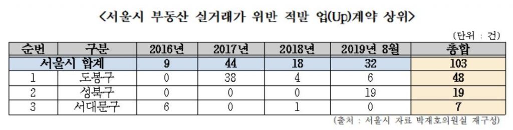 위반유형은 양도소득세를 줄이기 위해 많이 이용하는 '다운계약'이 강서구와 송파구가 10건으로 가장 많았고 강남구 7건 순이었다. 반면 매수자가 다음 매도 시에 양도소득세를 축소하고 대출받는데 유리하게 조작키 위한 '업계약'은 도봉구가 42건으로 가장 많았고 서대문구 7건, 강남구 6건 순이었다.