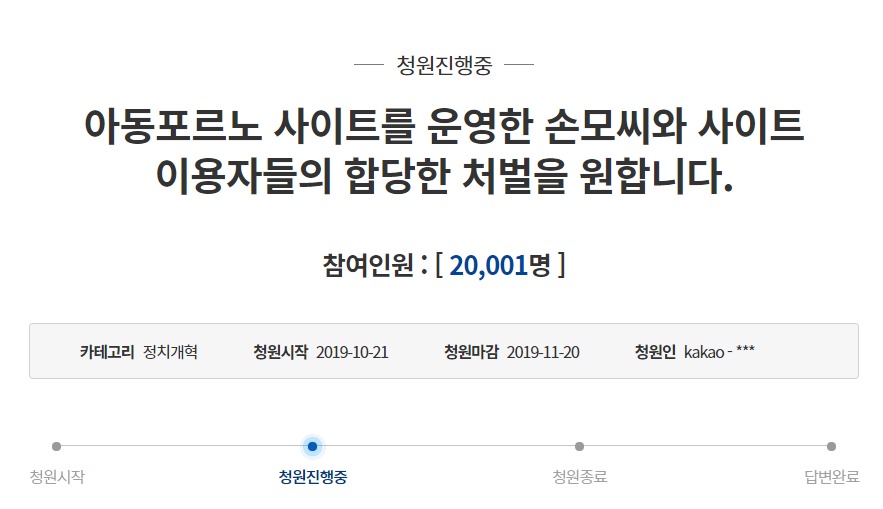 청원인은 "아동을 성적 대상으로 학대하며 이윤을 만들었다는 반인륜적 범죄가 어째서 한국에서는 '별것 아닌' 것처럼 여겨지며 범죄자가 솜방망이 처벌을 받는 것이냐"라면서 "전 세계가 집중하고 있는 사건에 대한민국 법은 국제적 망신을 시키려고 작정한 거냐"라고 밝혔다.