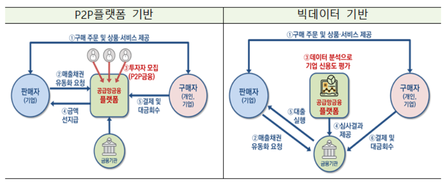 최근에는 핀테크 등을 활용한 공급망 금융이 등장했다. 가령 P2P 플랫폼을 통해 다수의 투자자가 소상공인 등의 다양한 어음 및 매출채권에 투자하는 것이다. 위험을 분산할 수 있을뿐더러 어음이나 채권 등을 유동화할 수 있는 점도 장점이다. 이외에도 전자상거래 업체, 카드사 등이 보유 데이터를 기반으로 신용도를 평가해 대출과 연계하는 빅데이터 기반 공급망 금융도 가능하다. 전자상거래 매출내역이나 판매자 평판, 카드 결제 데이터 등 비금융정보를 활용해 소상공인의 신용을 파악하는 방식이다.