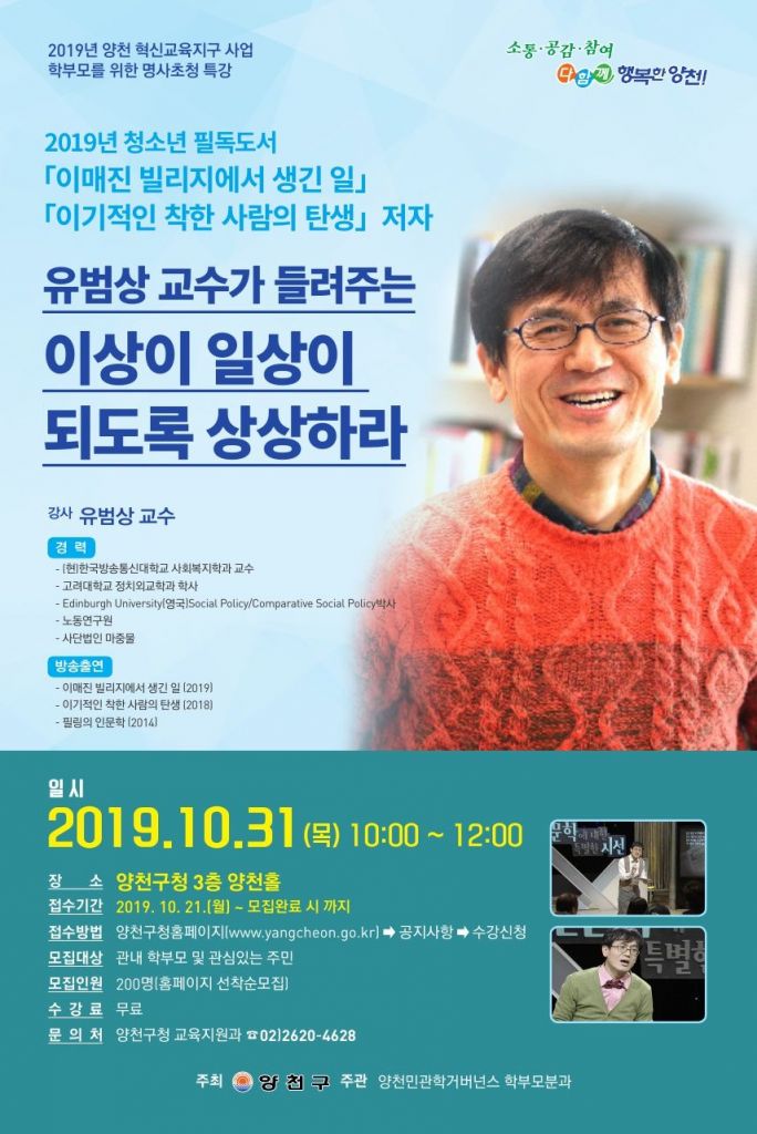 [아시아경제 박종일 기자] 양천구(구청장 김수영)는 31일 오전 10시 양천구청(목동동로 105) 3층 양천홀에서 ‘이상이 일상이 되도록 상상하라!’를 주제로 학부모를 위한 명사초청 특강을 연다.