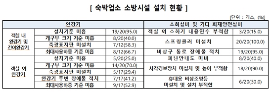 한국소비자원은 수도권 숙박업소 20곳에 관한 안전실태 조사 결과를 24일 발표했다. 조사된 숙박업소 대부분에 소방시설이 미비한 경우가 많아 화재에 취약한 것으로 나타났다. 조사 대상 20곳 중 19곳의 객실 내 완강기 비치 상태가 2015년 강화된 기준에 맞지 않은 것으로 나타났다. 19곳에서는 비상구 통로에 장애물이 쌓여 대피가 어려웠고 20곳 모두 스프링클러가 제대로 설치돼 있지 않은 상태였다.
