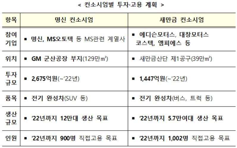 명신 컨소시엄은 2675억원을 들여 옛 한국GM 군산공장에서 빠르면 내년부터 전기차 생산에 돌입해 2022년까지 12만대 생산 체제를 갖추고 900명을 직접 고용하기로 했다. 새만금 컨소시엄은 1447억원을 투자해 새만금 산단 제1공구 39만㎡에 전기차 생산라인을 구축한다. 여기에서는 전기버스, 전기트럭, 골프카트, 의료용 스쿠터 등을 양산할 예정이며 2022년 5만7000여대 생산과 1002명 직접고용을 목표로 잡았다.