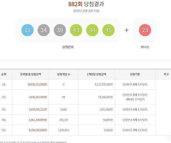 5개 번호와 보너스 번호를 맞힌 2등 44명은 당첨금 7816만8000원을 지급받으며, 5개 번호를 맞힌 3등 2082명은 당첨금 165만1966원을 받는다.