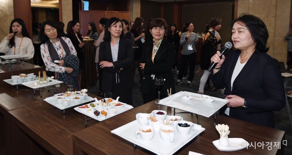 30일 서울 중구 롯데호텔에서 아시아경제 주최로 열린 '2019 아시아여성리더스포럼- 네트워크 & 디너파티'에서 강연자와 멘토단을 비롯한 참가자들이 경험과 노하우 등을 공유하고 있다./김현민 기자 kimhyun81@