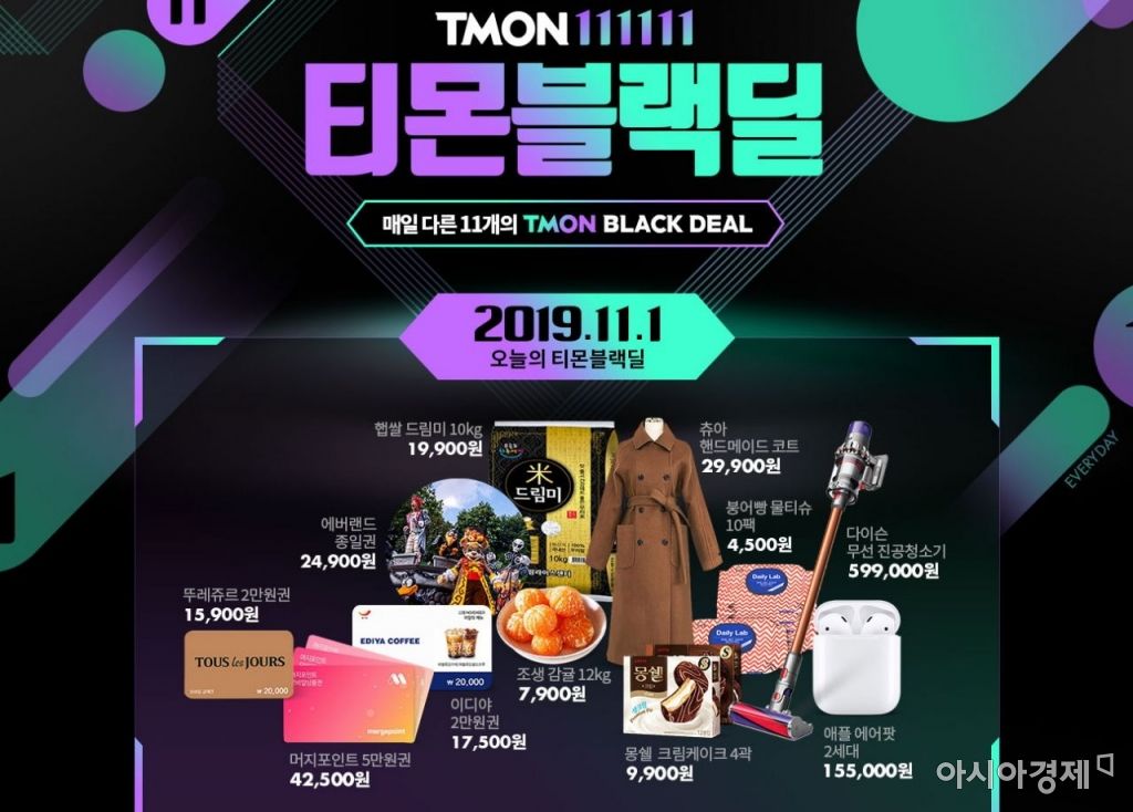 [아시아경제 한진주 기자] 티몬이 최대 쇼핑의 달 11월을 맞아 전례없는 쇼핑축제 ‘티몬 111111(십일십일십일)’을 진행한다. 온라인 최저가에 선보이는 에버랜드 얼리버드 이용권부터 에어팟2를 15만5000원에 판매하는 등 11가지 티몬블랙딜을 선보인다.