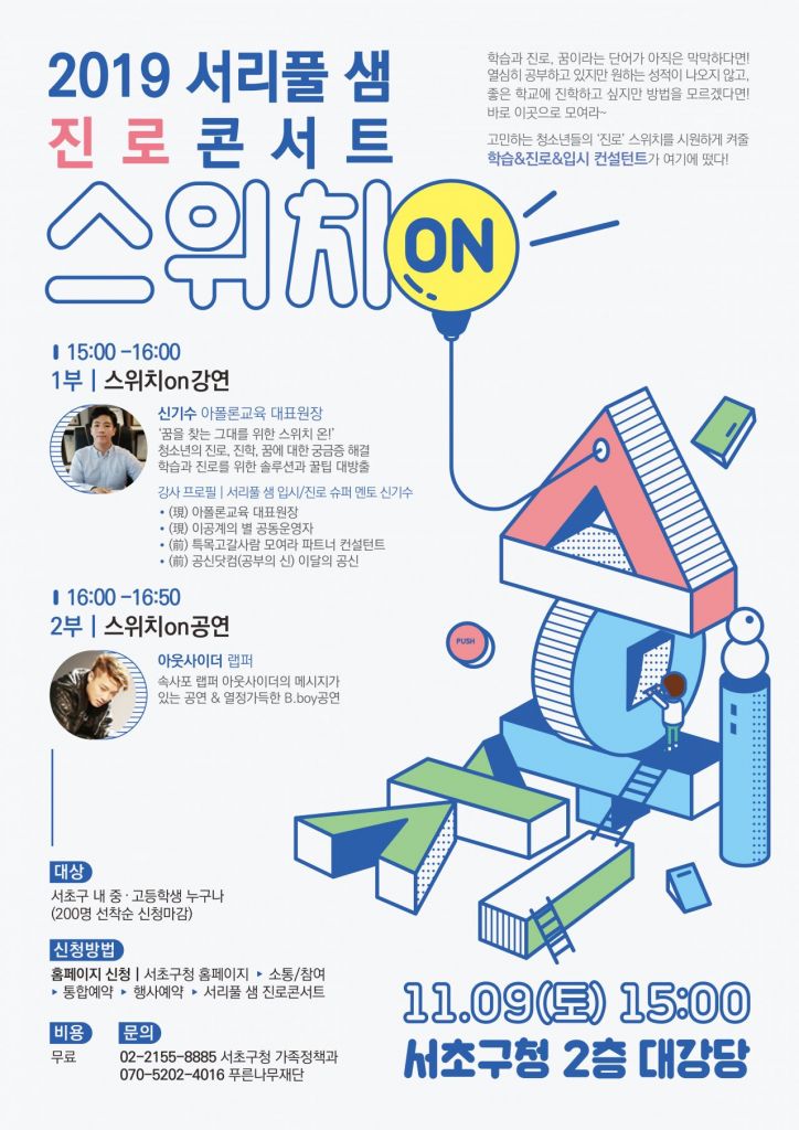 [아시아경제 박종일 기자] 서초구(구청장 조은희)는 9일 오후 3시 서초구청 2층 대강당에서 진로, 진학에 관심 있는 중·고등학생 200명을 대상으로 서리풀 샘 진로콘서트 ‘스위치 온’을 개최한다.
