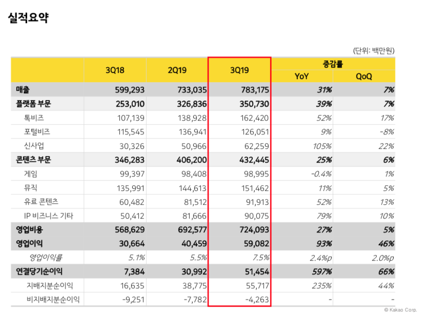 카카오(공동대표 여민수, 조수용)는 연결 기준으로 올해 3분기 실적을 집계한 결과 매출 7832억원, 영업이익 591억을 기록했다고 7일 밝혔다. 매출은 전분기 대비 7%, 전년 동기 대비 31% 증가해 분기 최대 매출 기록을 경신했다. 이전 분기 최대 매출 기록은 전 분기의 7330억원이었다. 영업이익도 2015년 이래 가장 높은 성과를 기록했다. 카카오 관계자는 "구조적으로 내실있는 성장을 이뤄냈다"며 "카카오톡 비즈보드(이하 톡보드)를 중심으로 한 수익 확대와 유료 콘텐츠의 지속적 성장, 신사업 부문의 매출 증가세가 가속화되며 실적이 크게 개선됐다"고 설명했다.