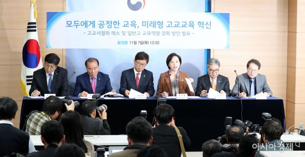 유은혜 사회부총리 겸 교육부 장관이 7일 정부서울청사 브리핑룸에서 자율형사립고와 외국어고, 국제고의 일반고 전환을 담은 '고교서열화 해소 및 일반고 역량 강화 방안'을 발표하고 있다. 왼쪽부터 도성훈 인천시교육감, 장희국 광주시교육감, 최교진 세종시교육감, 유 부총리, 이재정 경기도교육감, 조희연 서울시교육감. /문호남 기자 munonam@