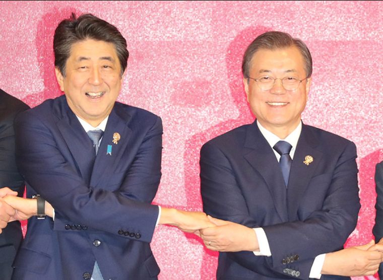 문재인 대통령과 아베 일본 총리가 지난 4일 오후 방콕 임팩트 포럼에서 열린 역내포괄적경제동반자협정(RECP)에서 참석 정상들과 기념촬영을 하며 환하게 웃고 있다. [사진=연합뉴스]
