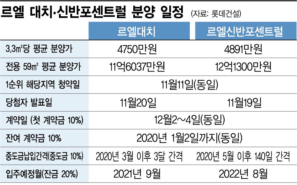 르엘 신반포 센트럴은 지하 3층 ~ 지상 35층, 7개동 596가구가 지어지고 이 중 전용면적 ▲59㎡ 13가구 ▲84㎡ 122가구 총 135가구가 일반분양된다. 르엘 대치는 지하 3층 ~ 지상 15층 6개동 273가구 규모로 전용 55~77㎡ 총 31가구가 일반에 공급된다. 두 단지 모두 11일 1순위 해당지역 청약을 진행한다. 다만 당첨자 발표는 신반포 센트럴이 19일, 대치가 20일이어서 두 단지 동시 청약이 가능하다. 입주 예정월은 대치가 2021년 9월, 신반포 센트럴이 2022년 8월이다.
