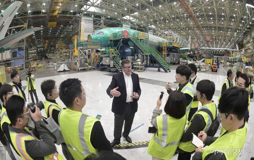 6일(현지 시간) 미국 워싱턴주 보잉 에버렛 공장에서 데이빗 리즈 투어 매니저가 항공기 생산 현황을 설명하고 있다./에버렛(미국)=김현민 기자 kimhyun81@