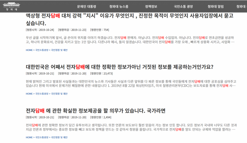 청와대 홈페이지 국민청원에 액상형 전자담배 관련 정확한 정보를 요구하는 글들이 다수 게시돼있다.